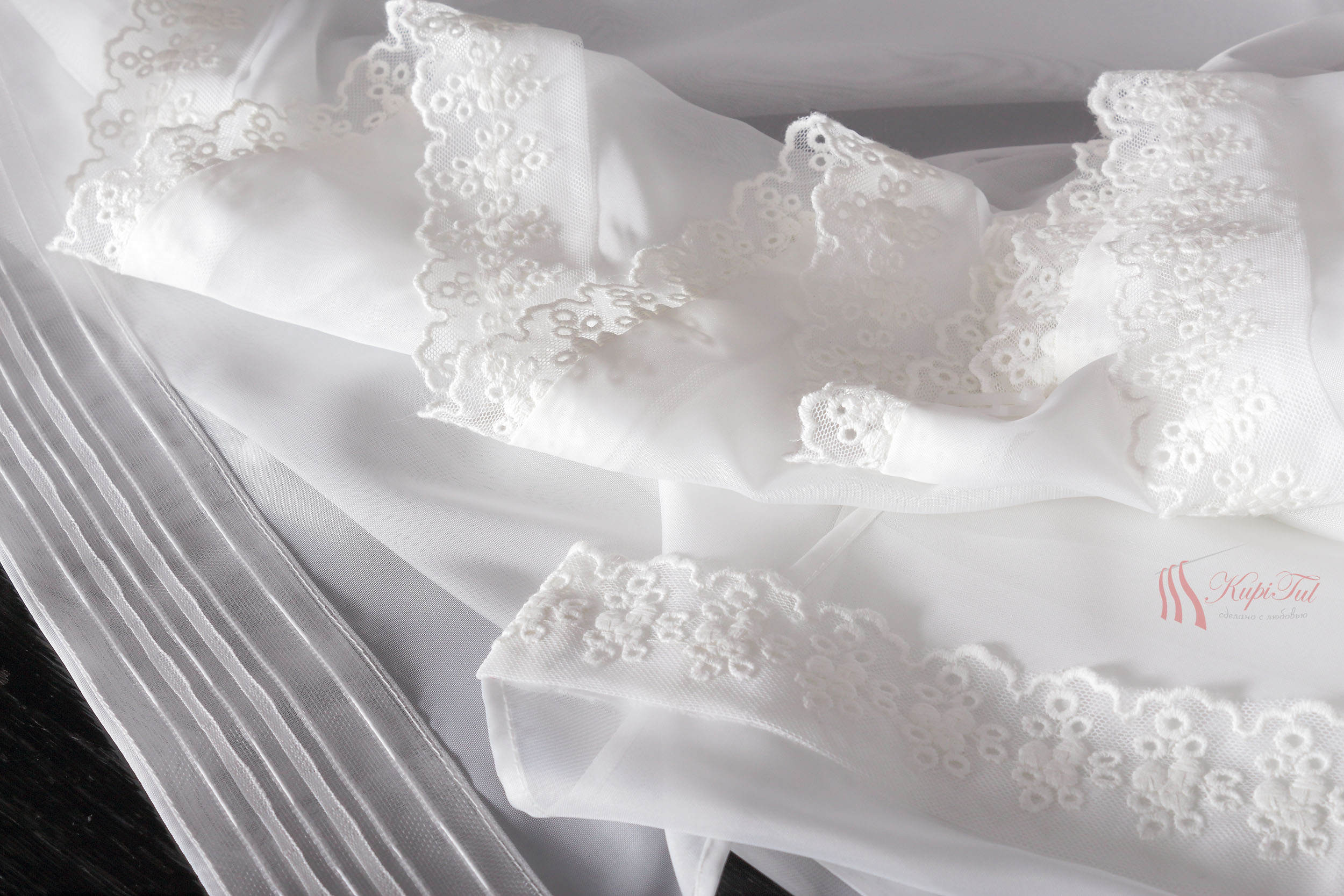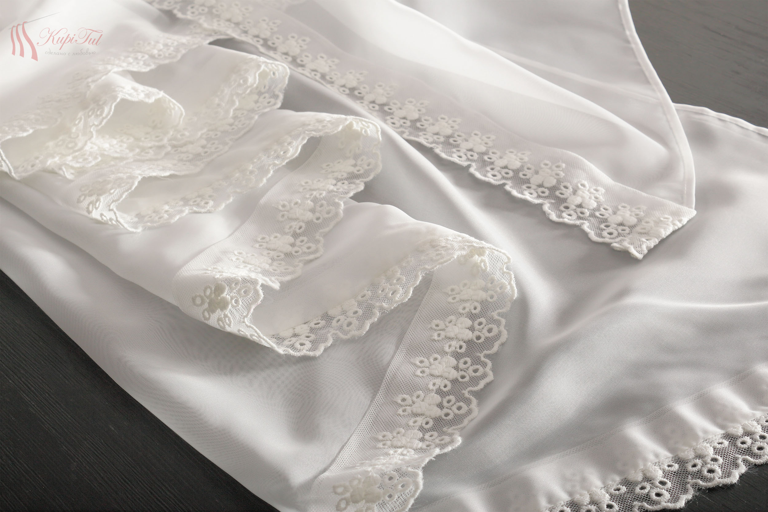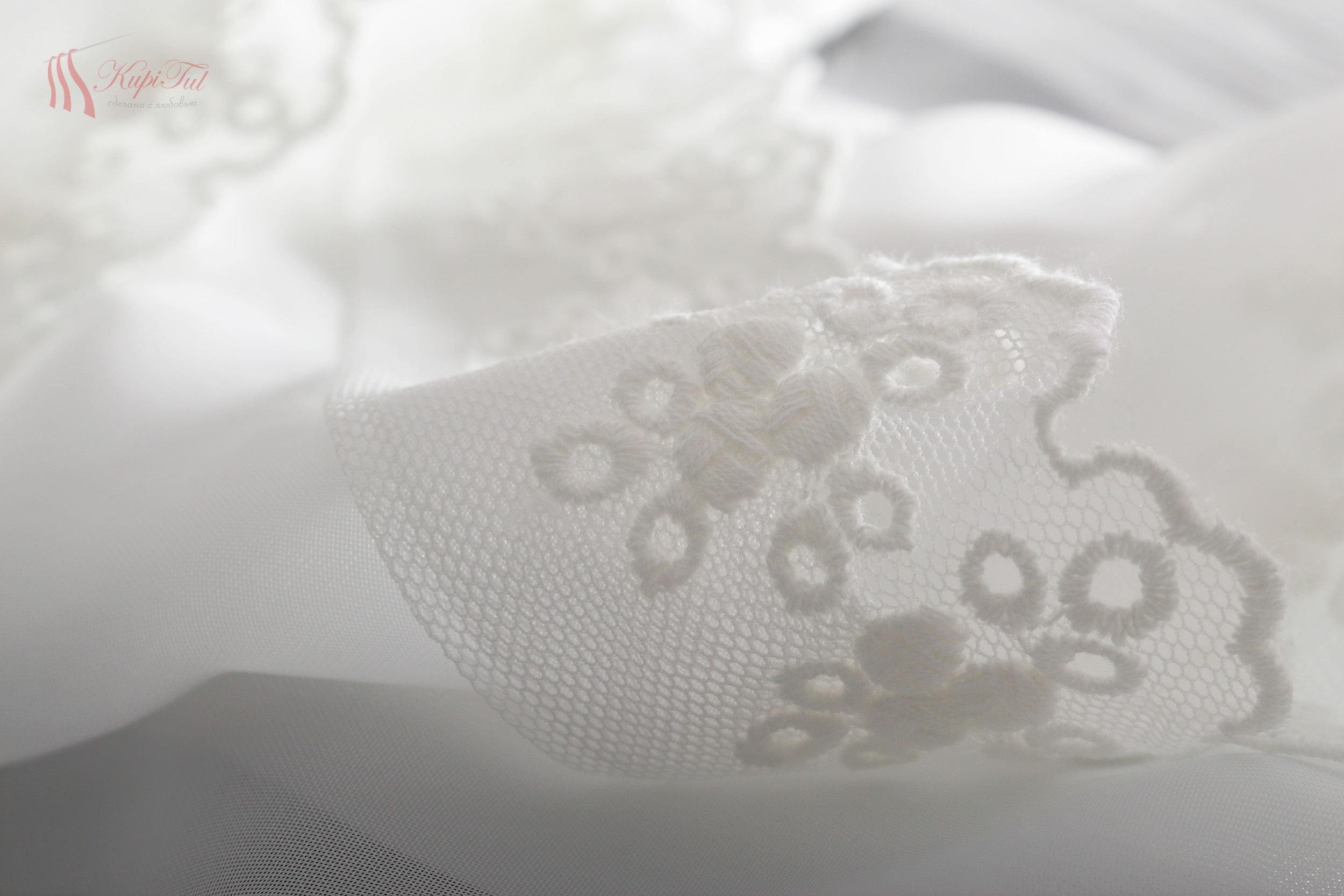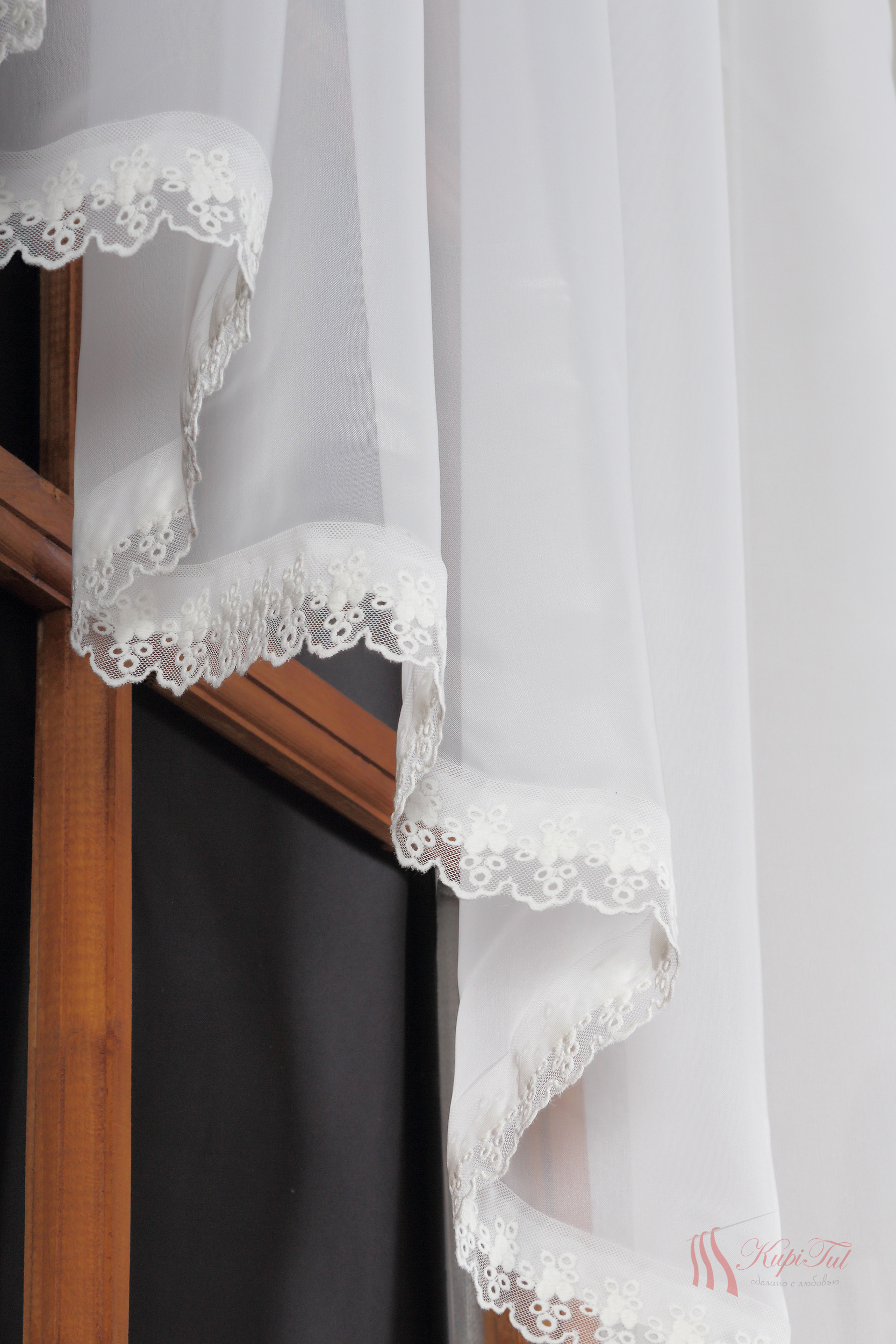 Тюль-арка вуаль с вышивкой молочного цвета оформлена купоном снизу с мелким флористическим рисунком.