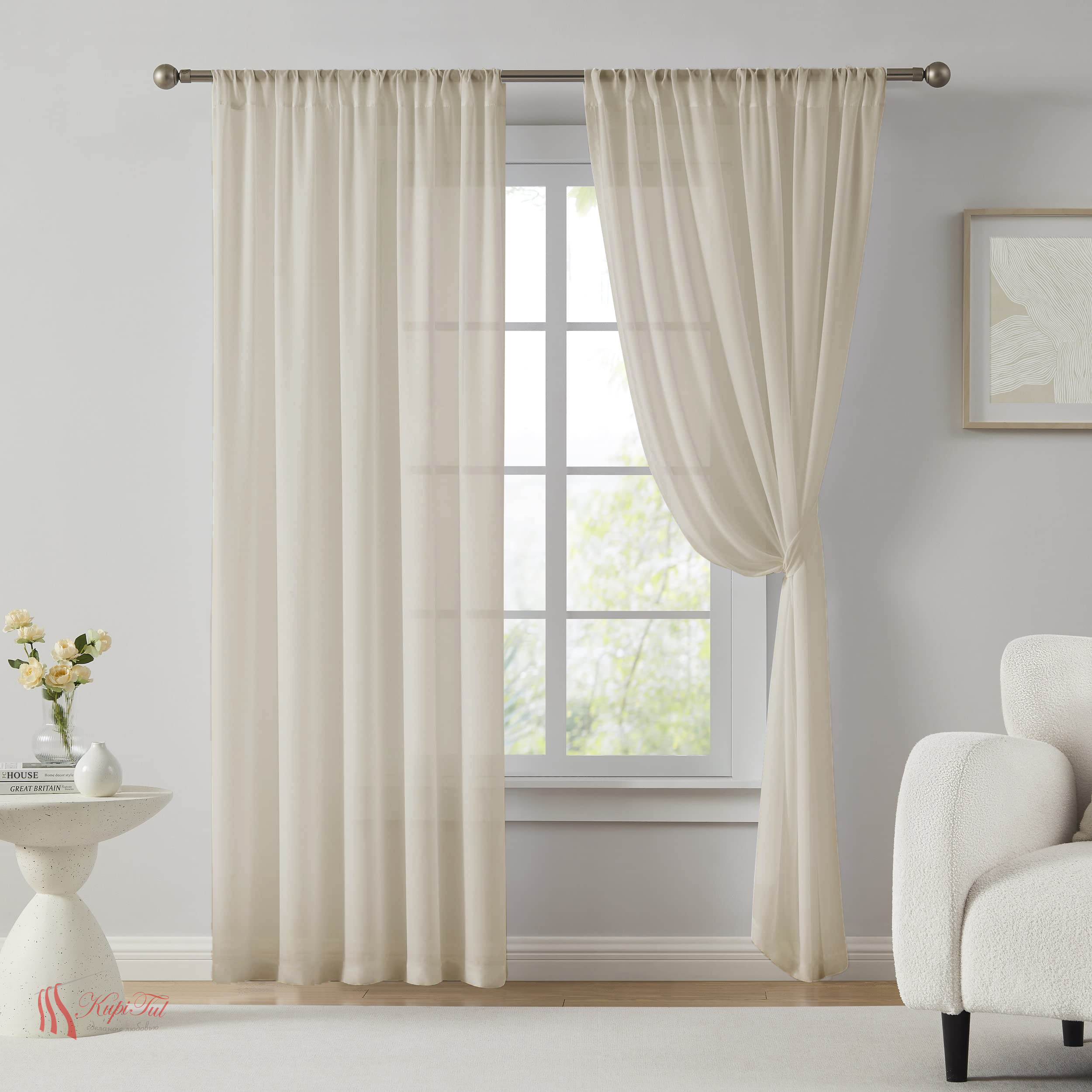 Материал красиво драпируется, не утяжеляет интерьер и гармонично сочетается с любыми шторами и портьерами.