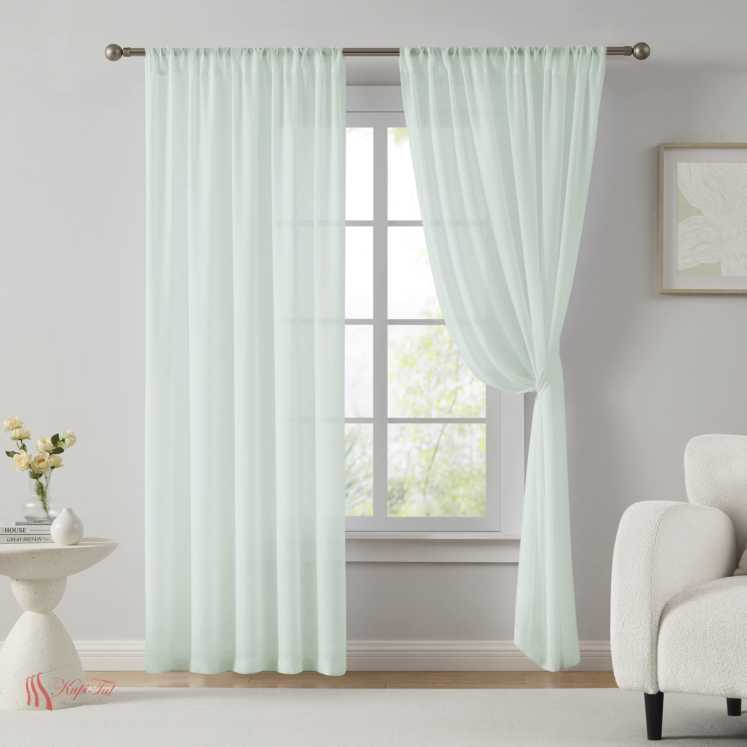 Материал красиво драпируется, не утяжеляет интерьер и гармонично сочетается с любыми шторами и портьерами.
