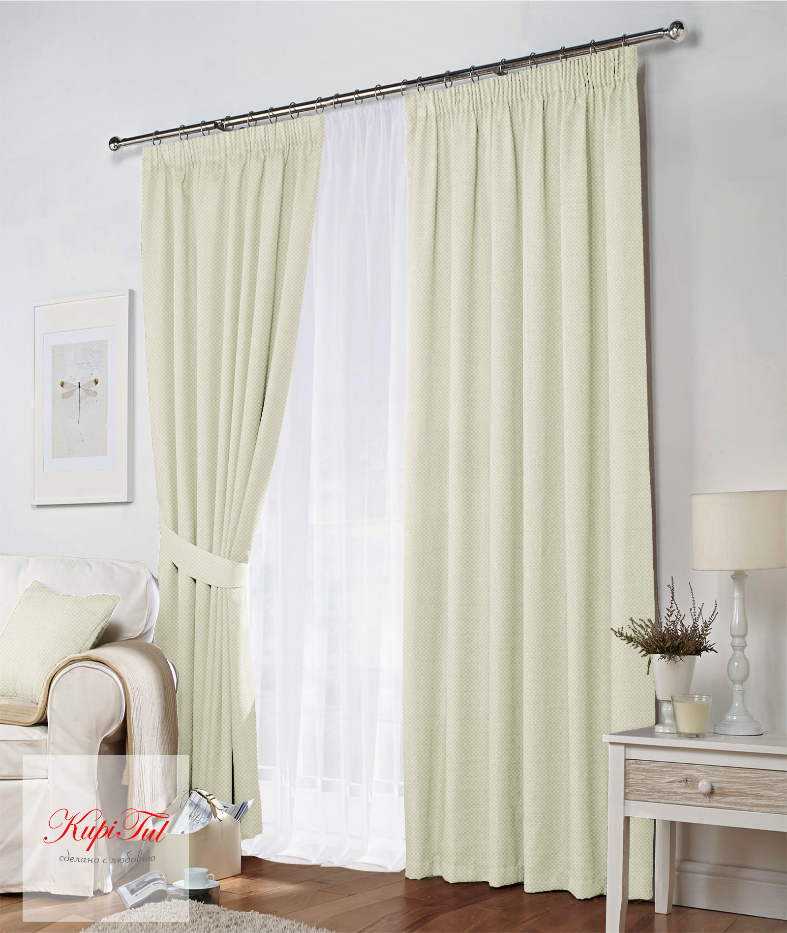 В комплект входят 4 полотна : (2 шт. портьеры и 2 шт. вуали) каждая на шторной ленте 6см (крепление за крючки).