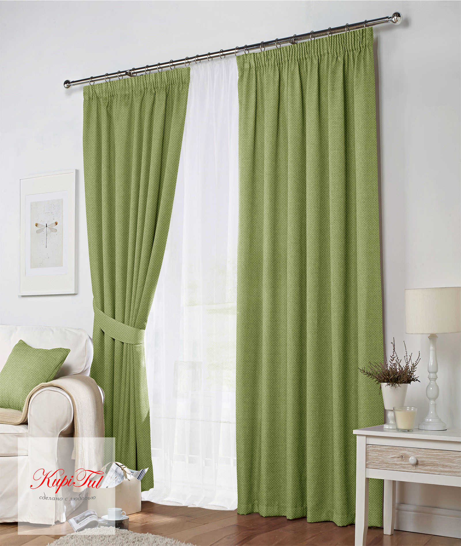 В комплект входят 4 полотна : (2 шт. портьеры и 2 шт. вуали) каждая на шторной ленте 6см (крепление за крючки).