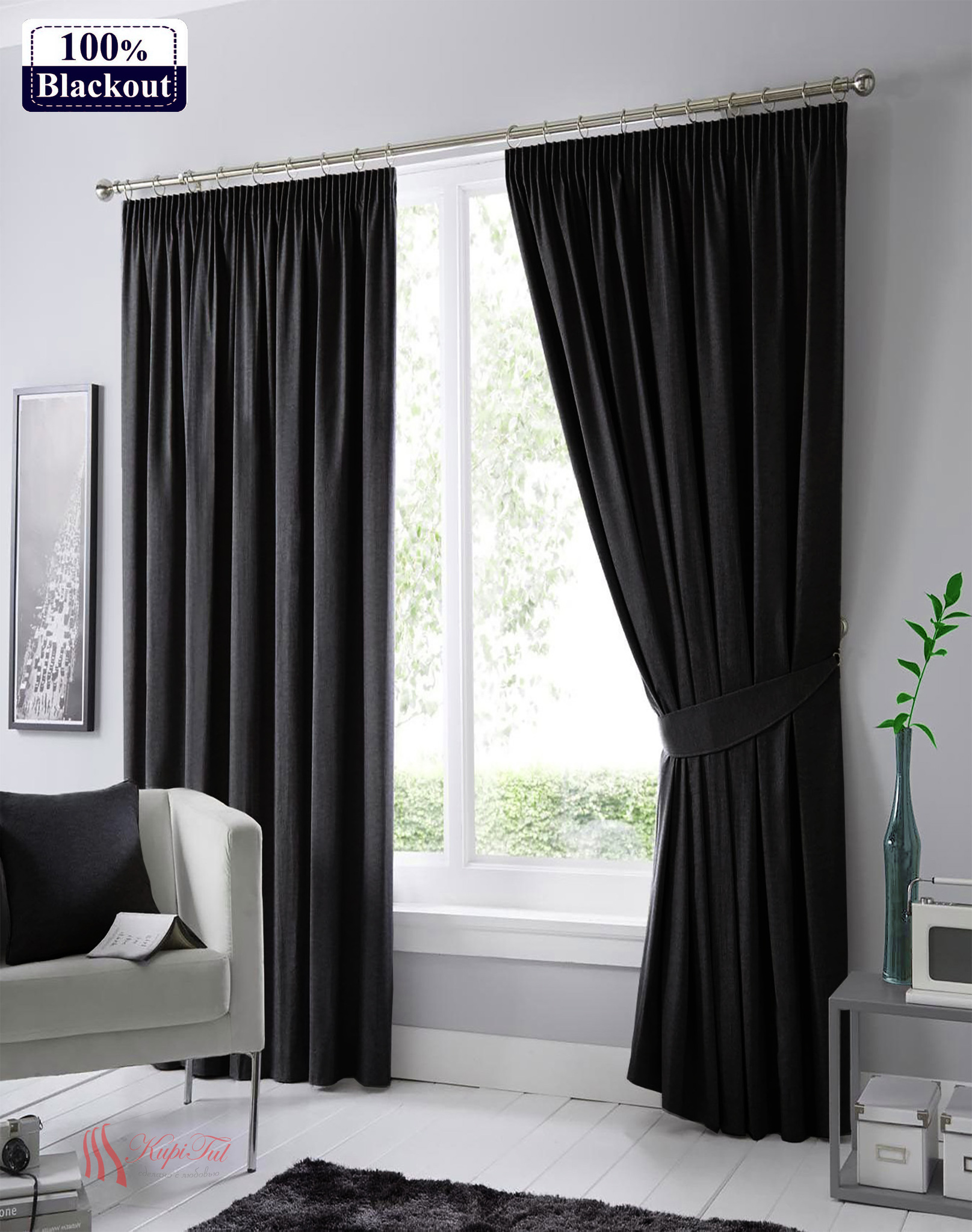 В комплект входят 2 полотна на шторной ленте 6см (крепление за крючки).